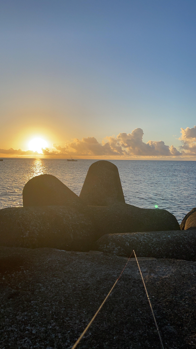 20分程、歩いて海岸に到着。河口部に光が見えて、釣り人を発見。さっそく声をかけに行きました。挨拶を交わして、釣り場の情報を聞きます。この人は地元の釣り師でよく来ているとのことでした。最近の様子は「今年は気温が高い、海水温も高いから、まだ魚が湾内には入ってこないよ。いるのはマイクロベイト(かなり小さい小魚)ばかりで、これだと青物(イナダ、ワサラ、ショゴなど)は釣るのは難しいかもね」とのことでした。この近くの釣り場としては、海岸沿いか、波止場の小さな漁港からしか竿が出せないとのことでした。僕はそこからさらに20分歩いて波止場まで行き、釣りを始めました。ちょうど現着したくらいから、東の地平線が明るくなり、ゆっくり太陽が昇ってくるのが見えました。僕は「一週間、家族が無事故で安全に、楽しく過ごせるように」朝日に手を合わせてました。