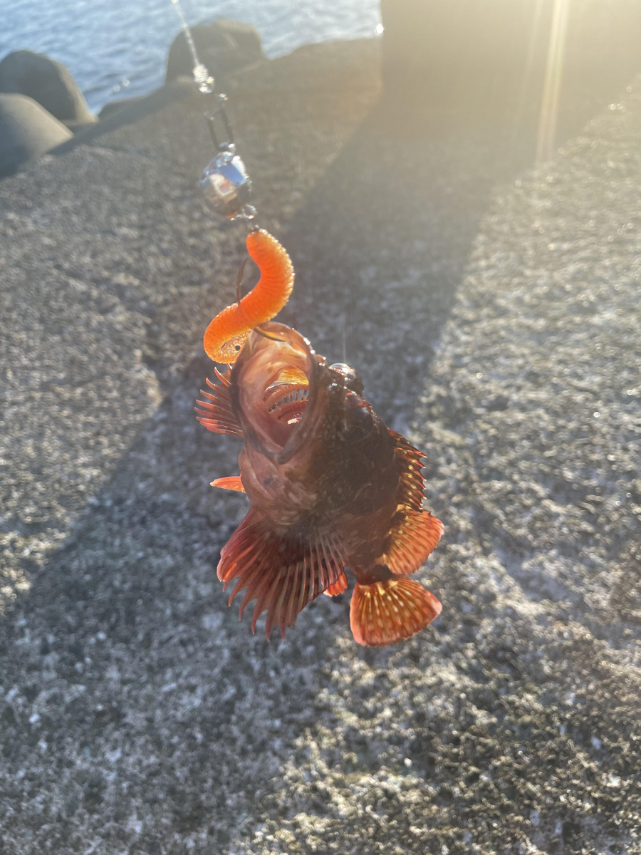 最初は青物を狙ってみようかと思いましたが、波止場周りの水深がどのくらいあるのか調査もかねて根魚(海底に根づいている魚)をターゲットにしました。あわよくばアカハタと呼ばれる高級魚が釣れたらいいなぁという淡い期待抱きつつ、海底をネチネチ、ワーム(疑似餌)で探っていると、25センチくらいの大きなカサゴが釣れました!結構強い引きだったので楽しませてくれました。このくらいの大きさのカサゴは煮つけにすると美味しい魚ですが、今日は調査で保冷バックを持って来てなかったので、そのままリリースしました。とりあえず魚がいることが確認できたので、明日から本格的に実釣します。